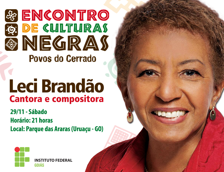 Como parte das comemorações pelo Dia Nacional da Consciência Negra (20 de novembro), o Instituto Federal de Goiás (IFG) vai promover, de amanhã (26) a sábado, o Encontro de Culturas Negras – Povos do Cerrado. O evento será realizado em Uruaçu, com a programação variada dividindo-se entre o câmpus do IFG, o Memorial Serra da Mesa e o Parque das Araras. Entre as muitas atividades do Encontro, destaca-se a programação cultural, que tem como principal atração a cantora Leci Brandão. Ela faz o show de encerramento do encontro, sábado, a partir das 21 horas, no Parque das Araras.