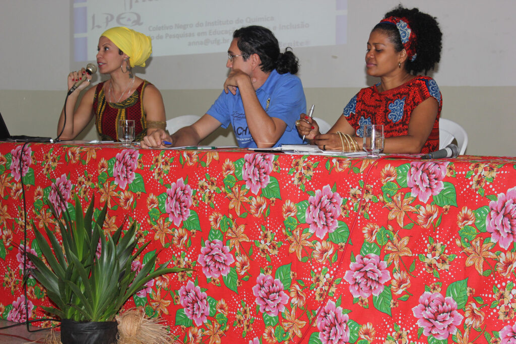 Anna Benite – do Coletivo Negro do Instituto de Química da UFG e também poetiza– afirmou que a ciência, na história da construção do saber, ajudou a legitimar a invenção do racismo. Segundo ela, na classificação dos seres vivos, feitas no século 18, o branco europeu foi classificado como o ser humano “ativo, inteligente e engenhoso”. “Isso não está em uso, mas ajudou a criar imaginários sociais que perseguimos até hoje”, disse.